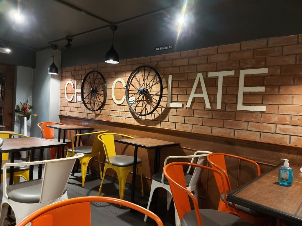 The Chocolate Room is tiny but mighty. A small counter is fitted to the left of stairs that lead up to a cozy mezzanine floor. The counter is interesting. It has rows of cute looking chocolates. Tempting for sure.