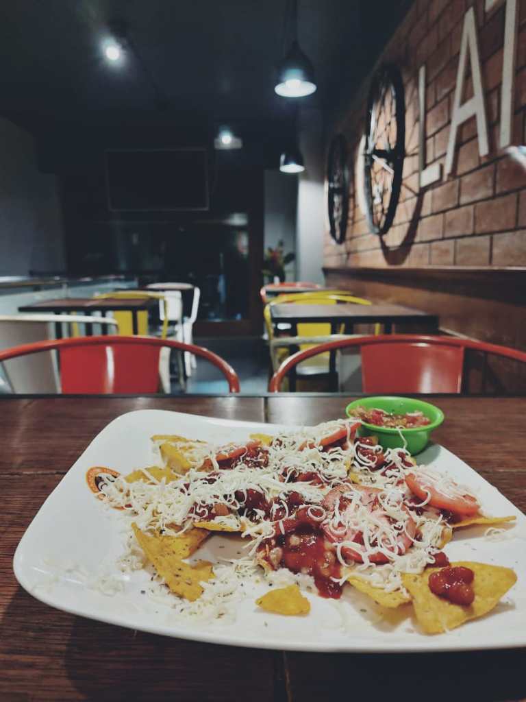 Service was prompt and chipper and it’s only a minute before the nachos arrive. Served with spicy salsa, they are a whoosh of cheese, veggies and crunchy flavour. My companion makes merry while I implore him not to drench the nachos with salsa.